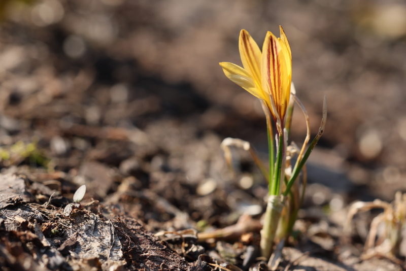 Crocus chrysanthus 'Mariette'. Zamówiłem te Krokusy, bo na zdjęciu wyglądały jak odmiana 'Gipsy Girl', której chciałbym mieć więcej, ale od kilku lat nie udaje mi się jej skutecznie dokupić (zawsze dostawałem 'Fuscotinctus', niezależnie od tego gdzie je kupiłem). Tak się złożyło, że obie wspomniane odmiany zakwitły u mnie w tym samym czasie, a ponieważ rosną ze dwa metry od siebie, to bardzo łatwo mogłem je ze sobą porównać. Okazuje się, że nie są identyczne, 'Mariette' jest wyraźnie jaśniejszy od 'Gipsy Girl', odcień żółci jest u nich bardziej cytrynowy. Co ciekawe w katalogu roślin cebulowych, który przysłała mi holenderska hurtownia, wedle zdjęć tych odmian powinno być odwrotnie.