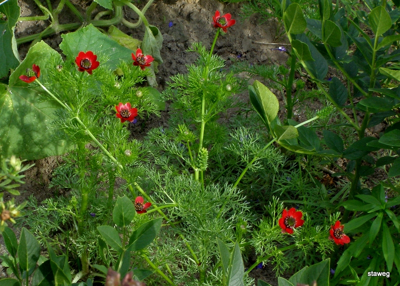 Liście ma wielokrotnie pierzastosieczne o wąskich odcinkach. Kwiaty na szczytach pędów zwracające uwagę intensywnym, czerwonym kolorem.