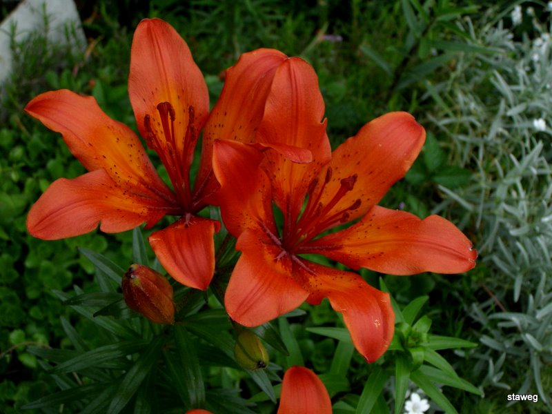 Kwiaty są duże (około 17 cm średnicy), czerwono-pomarańczowawe o płatkach wydłużonych, zwężających się u nasady. Cętkowanie prawie niewidoczne.