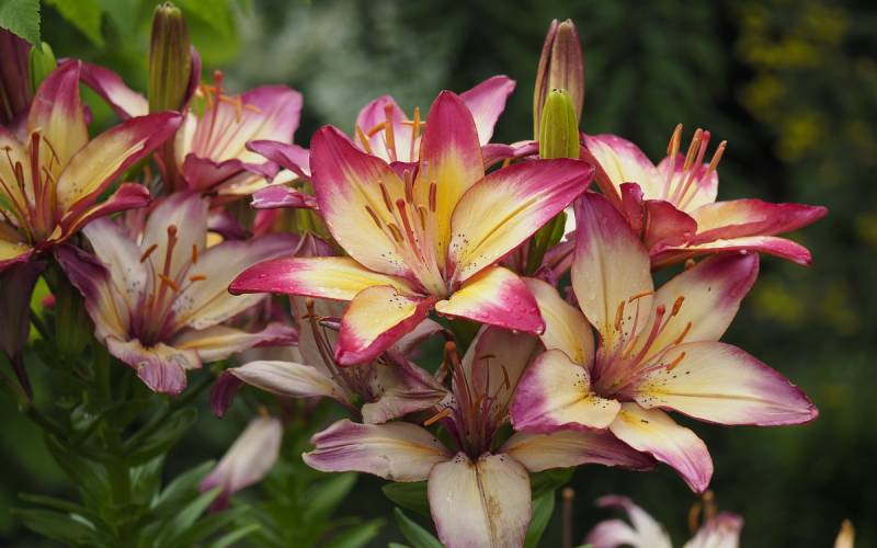 Wysokość: 110 - 120 cm, pędy mocne i sztywne Kwiat: dwukolorowy: aksamitny-żółty i lekko nakrapiany środek z malinowo-różowymi końcówkami, lilia bardzo efektowna i widowiskowa Kwitnienie: połowa lipca Wymagania: jak u mieszańców azjatyckich - przeciętna ziemia ogrodowa, może być lekko kwaśna (pH 5,5-6,5)