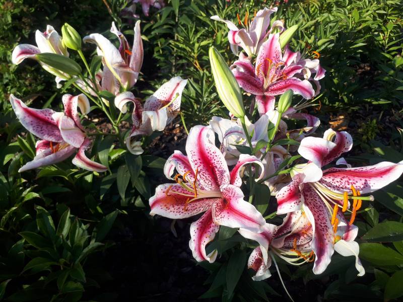Kwiaty: duże, skierowane na zewnątrz, białe ozdobione malinowo-czerwonymi paskami przez środek płatków i czerwonymi plamkami;