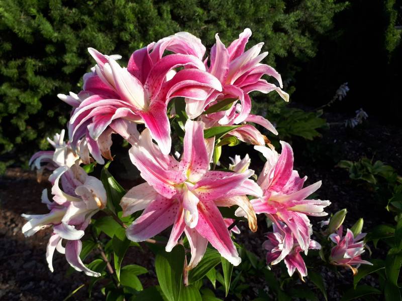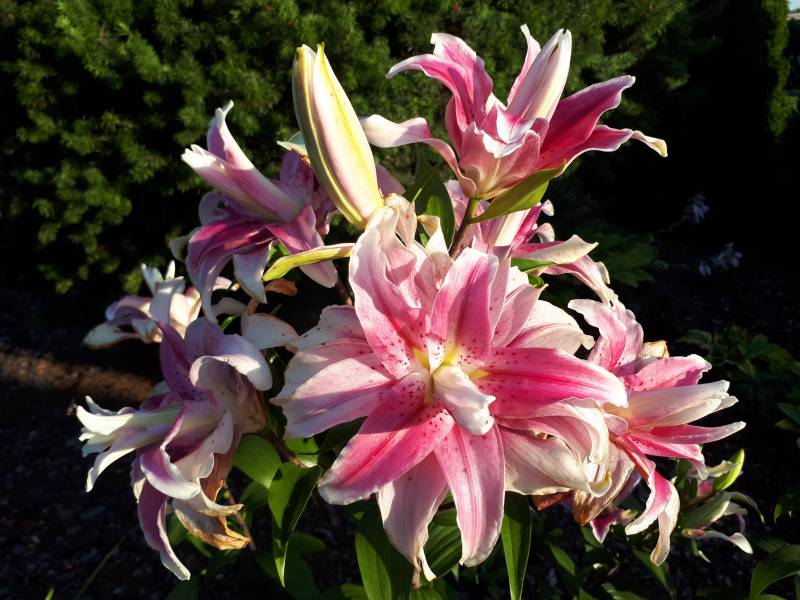 Kwiaty: duże, pełne, jasny do ciemnego różowego z białym nakrapianym środkiem;