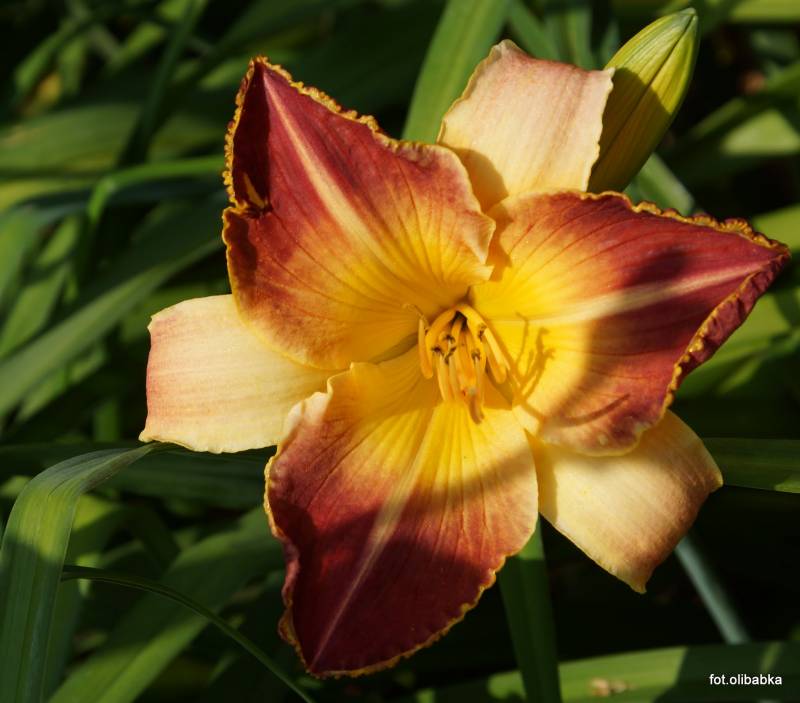 Kolor kwiatu, średnica:kremowy żółty z czerwoną końcówką płatków (bicolor), kremowe nerwy i zielone gardło; 15 cm.