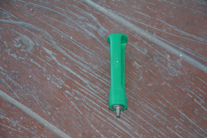 Na drugiej fotce pokazałem na dole dwa elementy służące do łączenia spryskiwacza z rurą zasilającą. Sam spryskiwacz łączy się z tymi elementami wężykiem 7/4 mm (typowy w systemach nawadniających, do kupienia w każdym sklepie z nawodnieniami, koszt ok 1 zł za metr), który naciąga się na końcówki. Warto przed naciąganiem zanurzyć końcówki wężyka we wrzątku (staje się bardziej elastyczny). Wężyk kupujemy z metra i przycinamy na wymaganą długość (w zależności od wysokości, na jakiej chcemy go zamontować, czyli w przybliżeniu nieco krócej, niż długość pręta, na którym go montujemy). Do jego przycinania możemy użyć zwykłych nożyczek. Montowanie do węża zasilającego wygląda tak:
