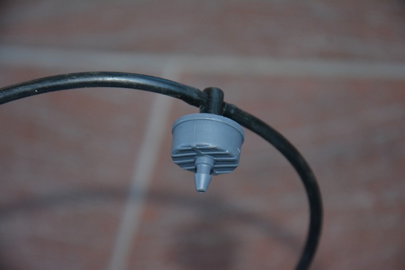 Ilość wody, jaką chcemy dostarczyć roślinie określamy poprzez dobór głowicy (dostępne są 2, 4 i 8l/h). Jak widać w pokazanym przypadku do głowicy podłączone są dwa kroplowniki (podlewanie z dwóch stron lub dwóch roślin), ale można podłączyć też jeden lub cztery w zależności od potrzeb. Można go oczywiście złożyć samemu dobierając choćby różną długość wężyków. Montuje się je podobnie jak mikrozraszacze. Prościzna :) Koszt całego kroplownika: ok 4 zł