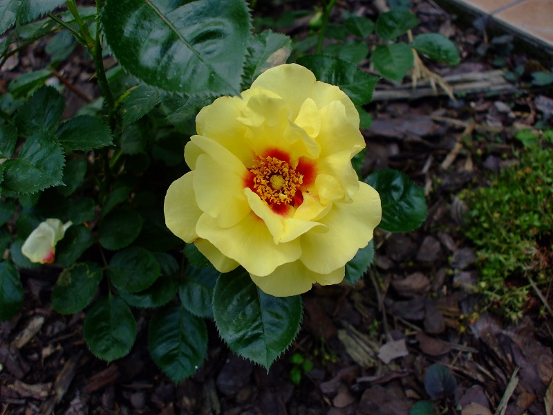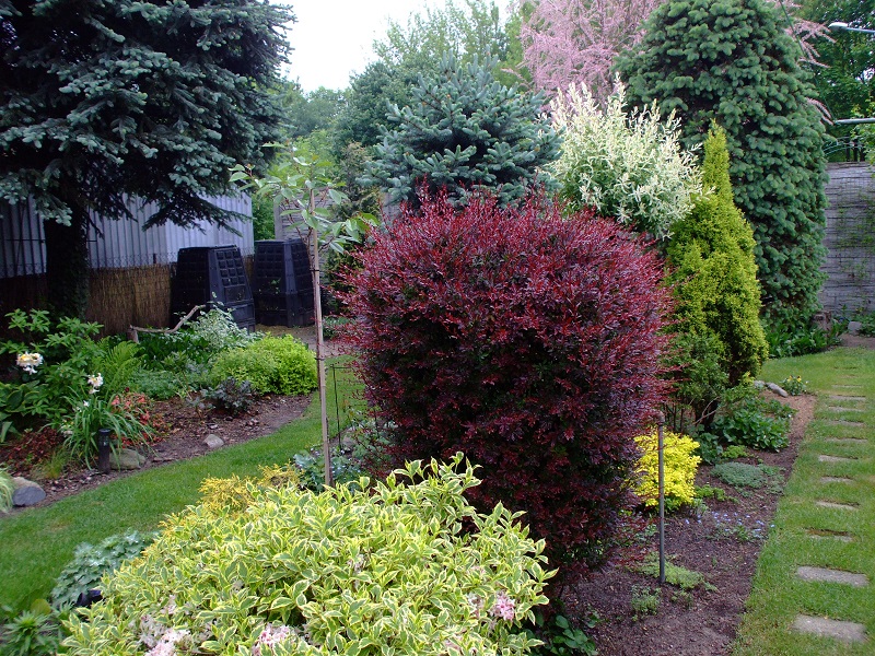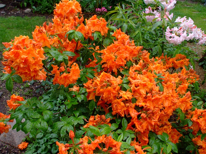 rododendrony zaczynają zakwitać, niektóre pojedynczymi kwiatami. Te dwa, co roku tak dziwnie zakwitają połową krzaczka, tą od słonecznej strony. Później zakwita druga strona.