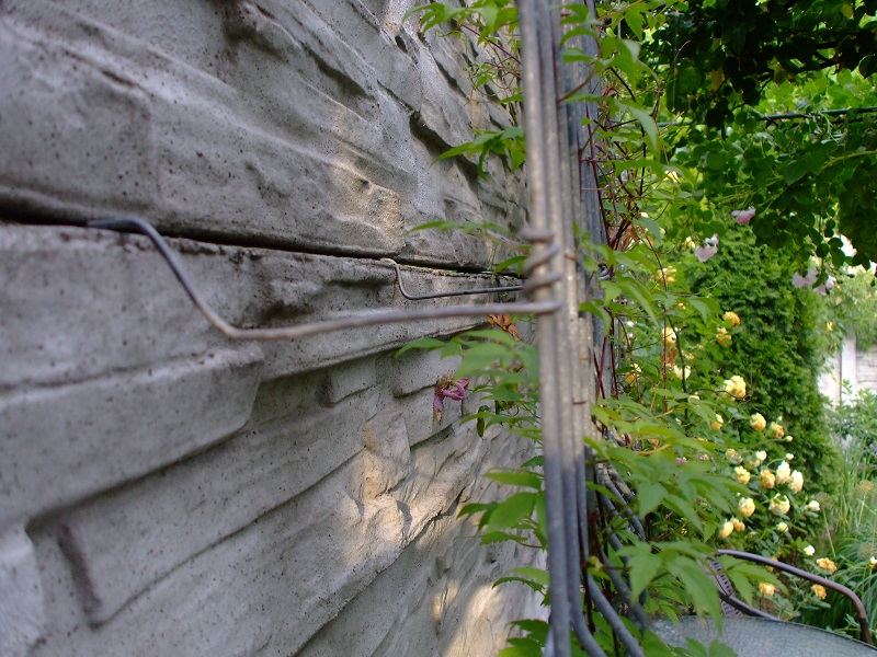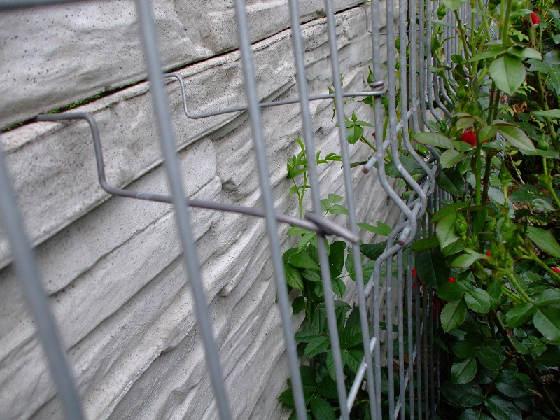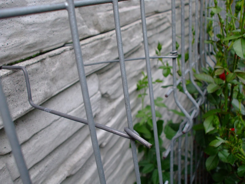 Kratka jest odsunięta od betoniaka tak na oko 15-20 cm, żeby był obieg powietrza. Jest przytwierdzona sztywnym drutem, który jest wsunięty między płyty i zakręcony z drugiej strony żeby nie wypadał. Mam nadzieję, że na zdjęciach w miarę widać o co chodzi. Przy okazji widać, jak się róże gotują