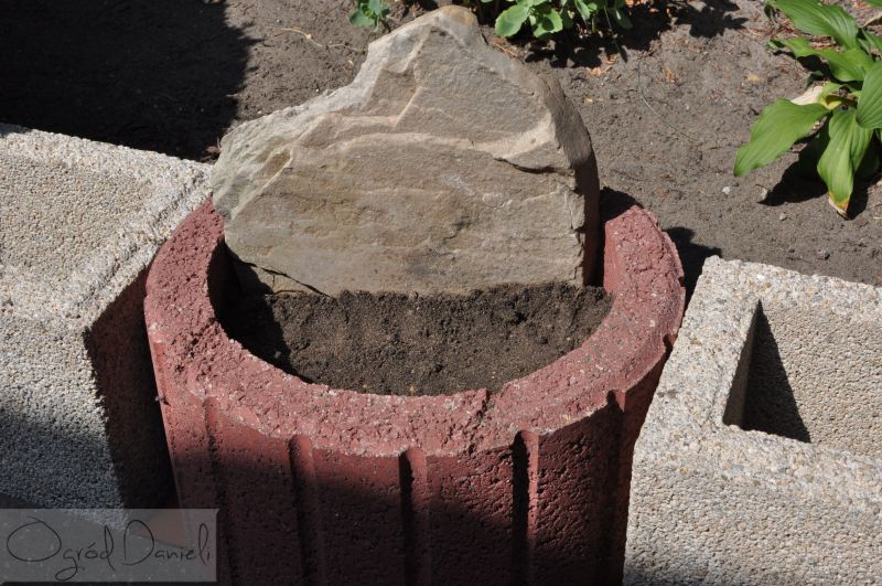 Tadeusz ustawił mi dwa prostokątne gazony, a w środku jeden okrągły o średnicy ok. 35 cm (średni). Gazony takie są dostępne w marketach budowlanych, ten czerwony kosztował niewiele więcej niż 6 zł. Widoczne także kamienie do szczelinowca, keramzyt i drobne kamyki