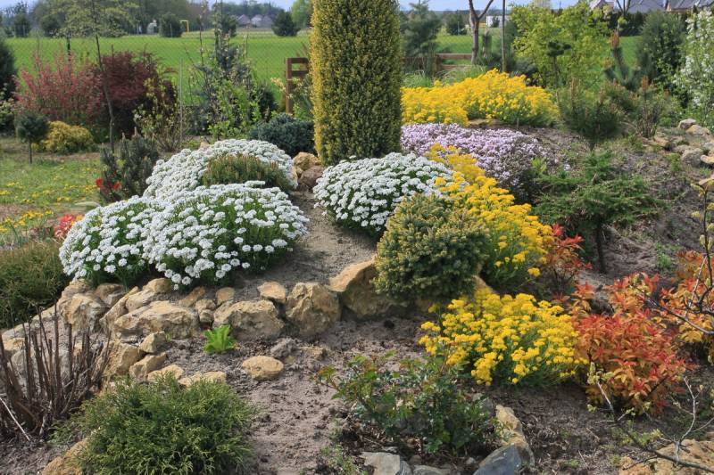 Beato kolorowe głazy fajnie kontrastują z roślinami i nie zlewają się z podłożem. Przez to ogród skalny zyskuje na wyrazistości.
