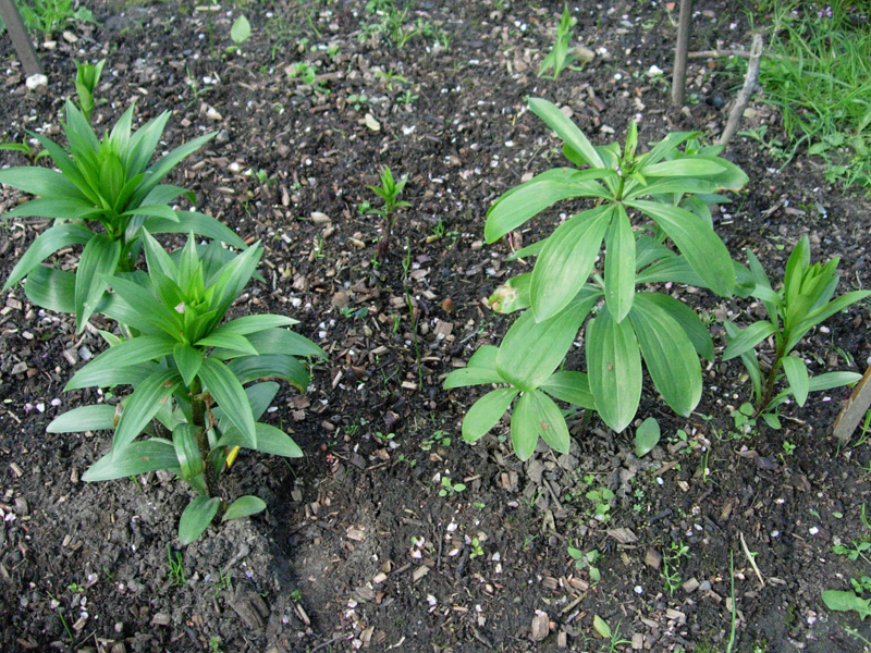 Tutaj jeszcze rzut oka na kwaśne poletko doświadczalne. Rośnie tu m.in. Lankongese (już wypuścił pęd) oraz domniemane – amerykanka i kanadyjka, choć jedna lilia jak nic wygląda mi na martagona. Jest to również miejsce lilii Fusion, która wyglądała równie żałośnie jak martagony (jeden cienki pędzik – w tym roku dwa i może zakwitnie – ta od lewej).