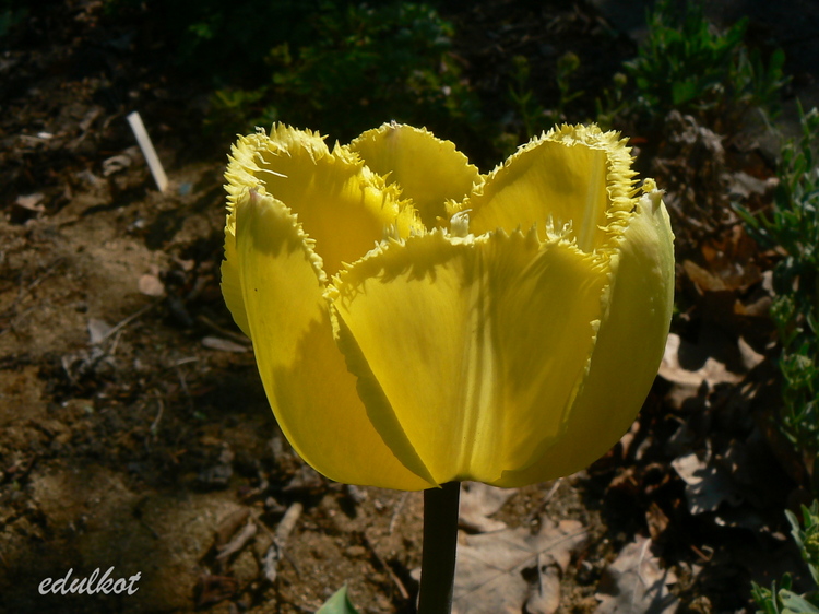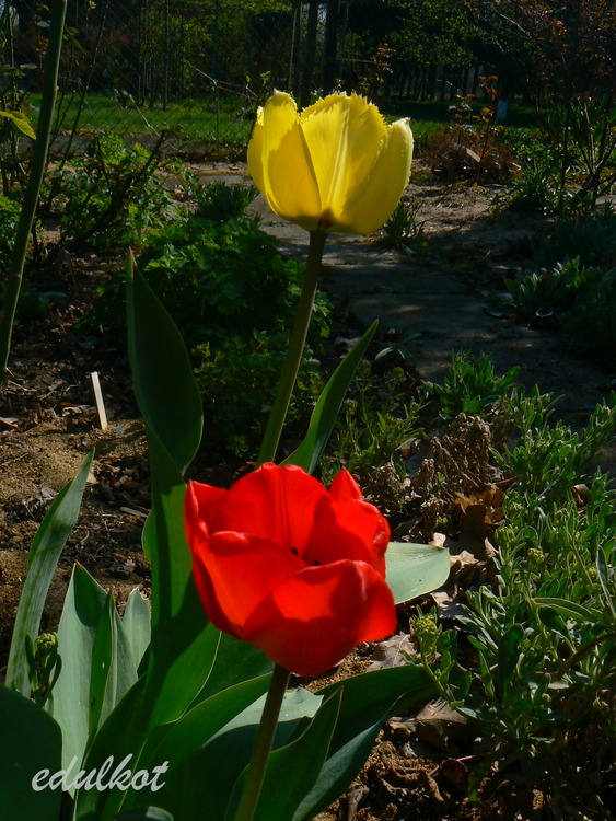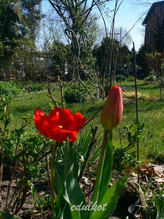 Jeszcze uchowały się jakieś stare tulipany w małym ogródku, kika ma pączki, w innych miejscach same liście, ale za 2 lata pewnie zakwitną.
