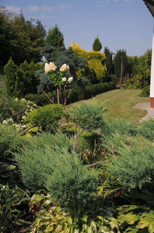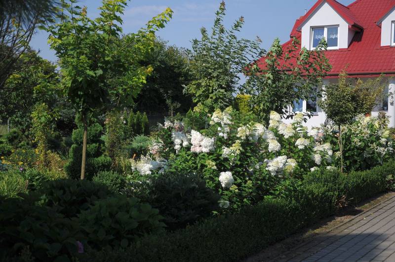 po drugiej stronie podjazdu królują hortensje. Widać głównie bukietowe, ale Ewa ma kilkadziesiąt
