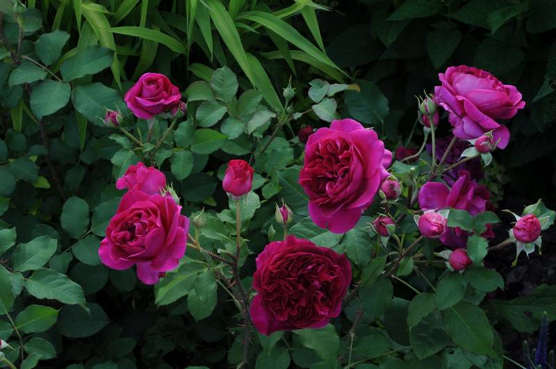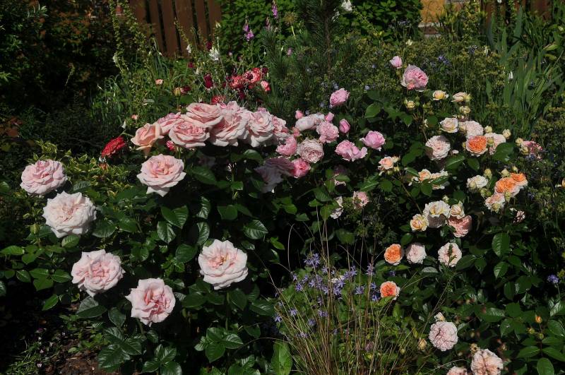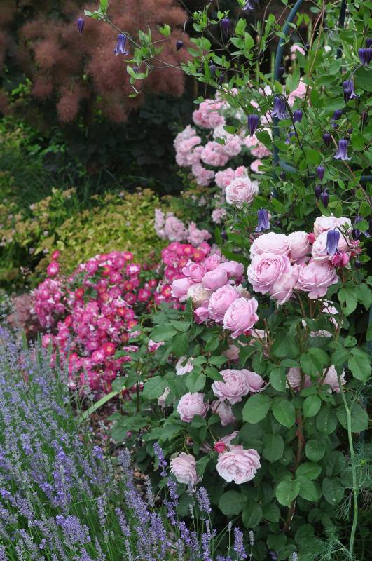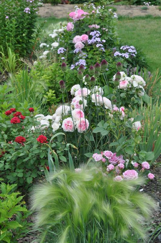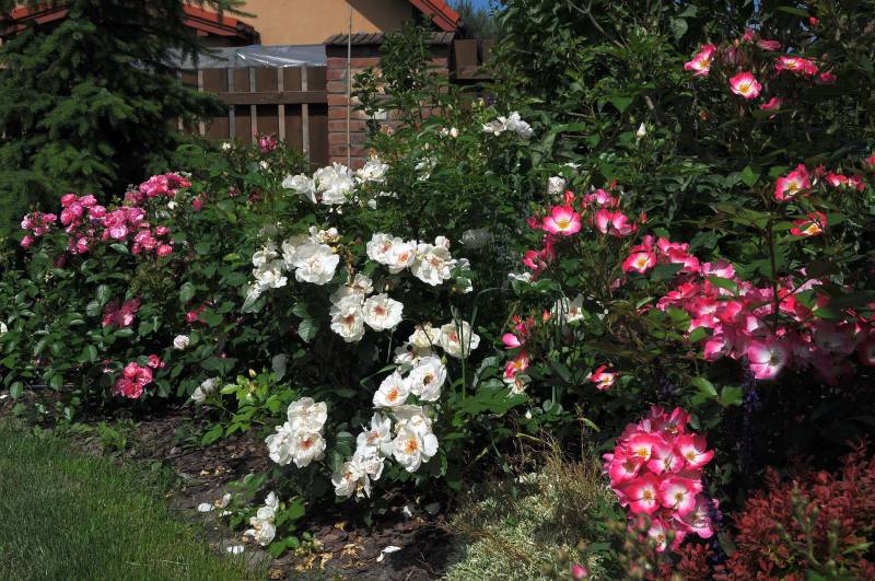 , głównie krzaczki lub same kwiatki, czasem w towarzystwie bylin. Prawda jest taka, że jak mam jakies zastrzeżenie do jakiegoś połączenia, to omijam aparatem, ewentualnie pokazuję tylko szczegóły. Ta tendencja świadczy o tym, ze jednak kompozycja jest dla mnie najważniejsza i jeśli są w niej braki, nieścisłości, czy niekonsekwencja, to jej nie pokazuję. Do tego nie wszystkie kompozycje wyglądają tak, jak w moich wyobrażeniach, a często przypadkowe zestawienia są tak trafione, jak sama nigdy bym na to nie wpadła. Dlatego znalazłam jeszcze trzy obrazki (tylko trzy), ale zawsze mogę zasypać Was zdjęciami pojedynczych róż