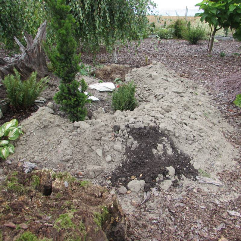 Trzeba tylko tę chałdkę ziemi przerobić z kompostem, ziemią bukową, żwirem, wermikulitem, włóknem kokosowym i częściowo z gruzem wapiennym. Później już tylko sadzenie, ściółkowanie i cieniówki. Zostały nam tylko dwa dni, oby pogoda dopisała..........................
