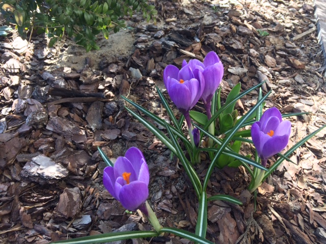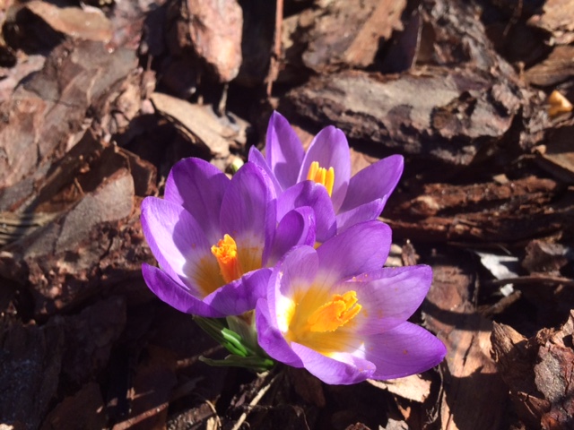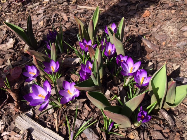 tu na razie skromnie, bo krokuski niskie, część w szczypiorach.. Maluszki dzielnie jednak kwitną tuż po wystawieniu nosów znad kory