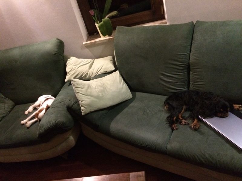 Jestem lekko spięta, ale cieszę sie, że maluch nie jest atakowany cały czas za siedzenie na kanapie. Jest akceptowana sytuacja, że maluch spi na kanapie obok mnie, a Cyguś ułożył się na podłodze przy kanapie.