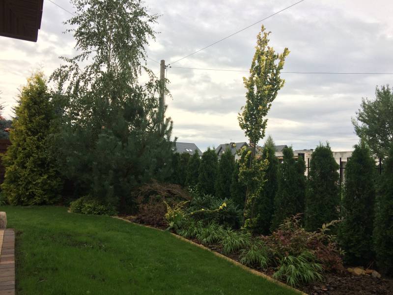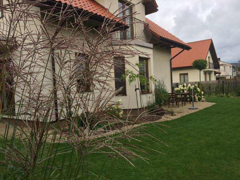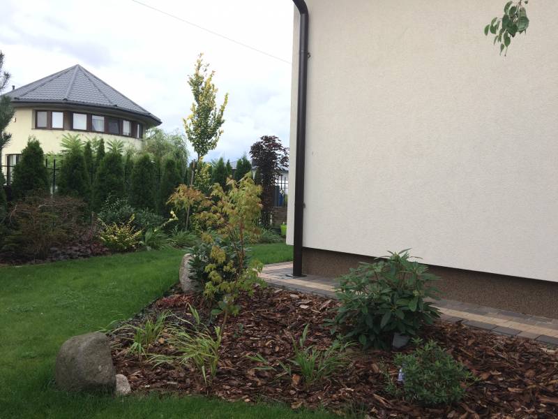 za domem już całkiem nieźle trawa wzeszła, oczywiście widzę sporo dziur, ale to raczej do dopracowania w przyszłym roku. Na razie z przyjemnością patrzę na okolice tyłu domu- miejsca które usilnie omijałam wzrokiem- jest opaska, schludny trawnik, nowa rabata rodkowa.