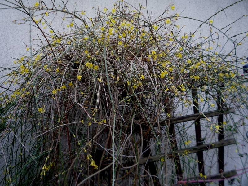 Ewo ten na żółto kwitnący krzew. to jaśmin nagokwiatowy kwitnie jesienią i wczesną wiosną .