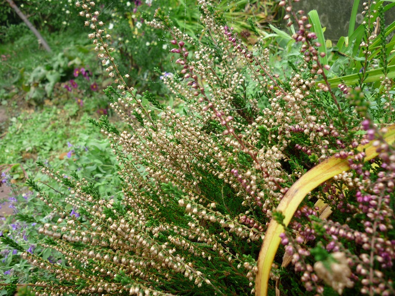 Sierpień - nie mam zdjęć całej rabatki, ale zaczynają kwitnąć rozchodniki i wrzosy, ponownie kwitnie kocimiętka, jeszcze jeżówki i floksy późniejsze i liliowce brunatno-czerwone.