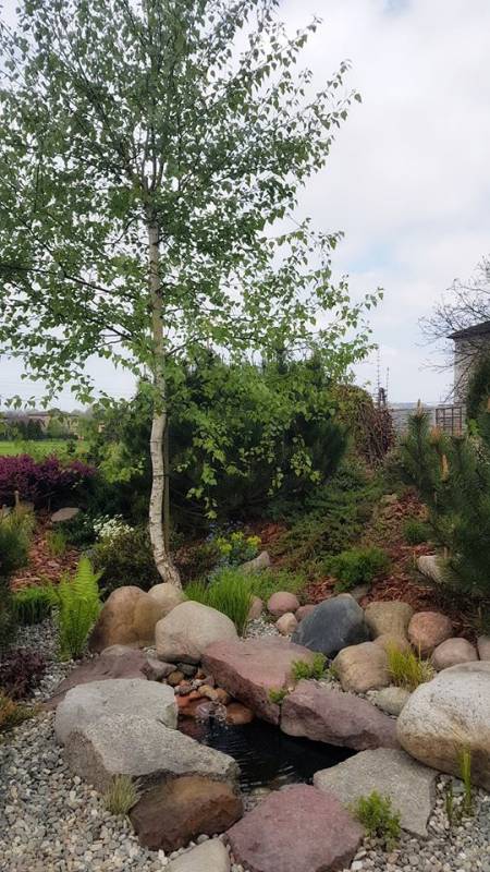 Mój M. chyba wziął sobie bardziej do serca to moje ogrodowanie i pomógł mi przerobić to małe oczko - wcześniej było obłożone tylko otoczakami, ale pies który polubił picie wody z tego miejsca ciągle je zrzucał. M. przytargał ze skalniaka płaskie kamienie granitowe. Są bardziej płaskie i stabilne. Pies się cieszy, a ostre krawędzie starałam się złagodzić otoczakami. Na razie tak musi być i już.