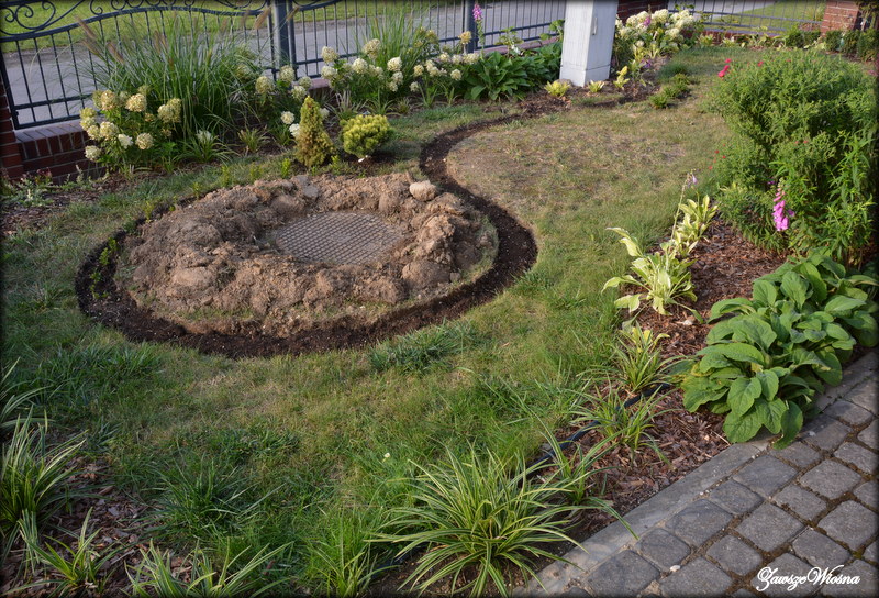 Zaczęłam znowu od wydzielenia miejsca na niska obwódkę bukszpanową, w celu zasłonięcia klapy przykrywającej jeden z kręgów. Chodziło mi również o kwestie bezpieczeństwa - żeby przypadkiem nikt (zwłaszcza dzieci, które lubią takie miejsca) nie wpadł do środka.