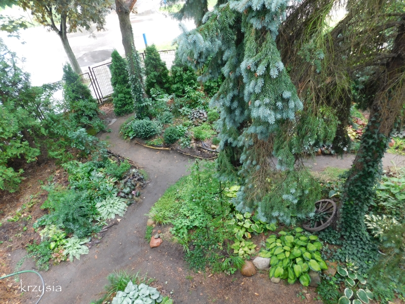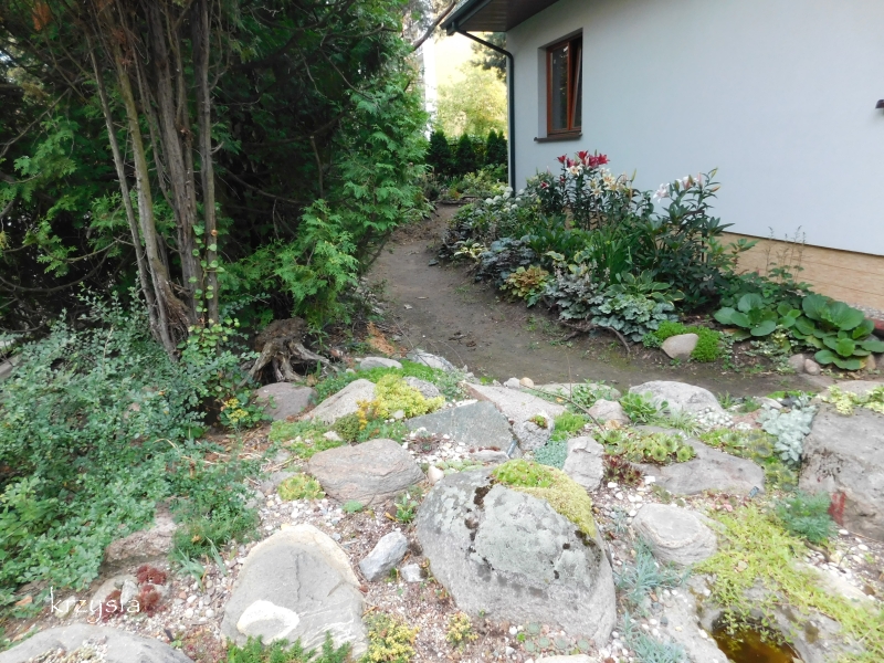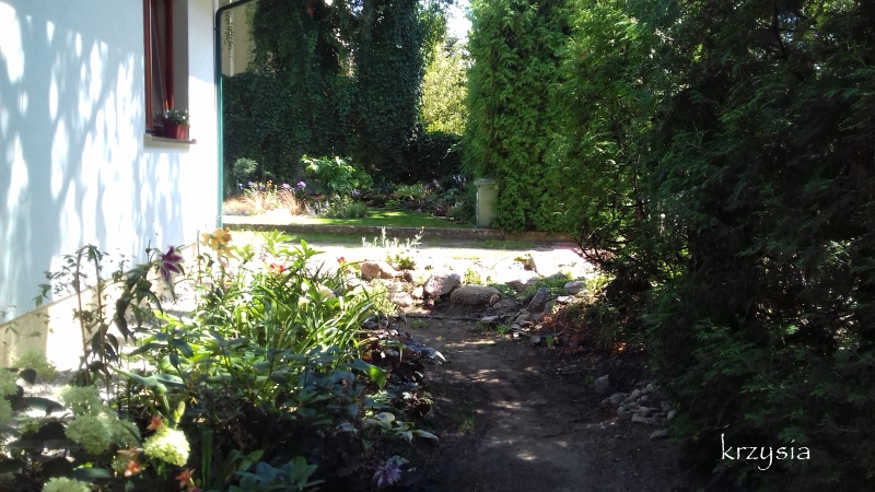 Pokazywałam już co się znajduje na lewo od furtki: skalniak, rabata z rh, liliami i liliowcami oraz ścieżka wzdłuż tuj w głąb ogrodu.