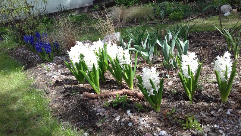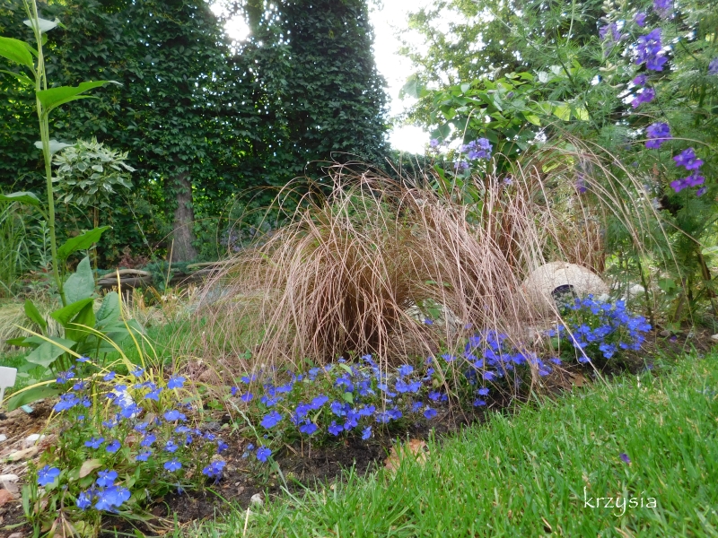 Jesienią przekopałam środek trawnika i próbuję wprowadzić tu trochę kolorów, to jedno z nielicznych bardziej nasłonecznionych miejsc, suchych i poprzerastanych korzeniami. Docelowo ma być częścią trawiastą ogrodu, czyli oprócz trawnika są też trawy ozdobne, czy się sprawdzą czas pokaże.