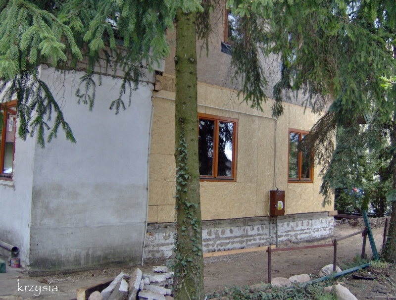 Trawnik za studnią opiera się o betonową opaskę wokół budynku byłego zakładu męża, teraz użytkowanego przez synów: młodszy traktuje go jak klub, a starszy urządził kącik elektroniczny, a ma tam niezły sprzęt, narzędzia i magazyn części odziedziczony po ojcu. Te rachityczne pnącza na siatce to resztki po chmielu, walczymy z nim wspólnie z sąsiadką. Tuż za naszą siatką jest wąski dojazd do posesji w głębi, więc od najbliższego sąsiada oddzielają mnie dwa płoty i kilka m między nimi.