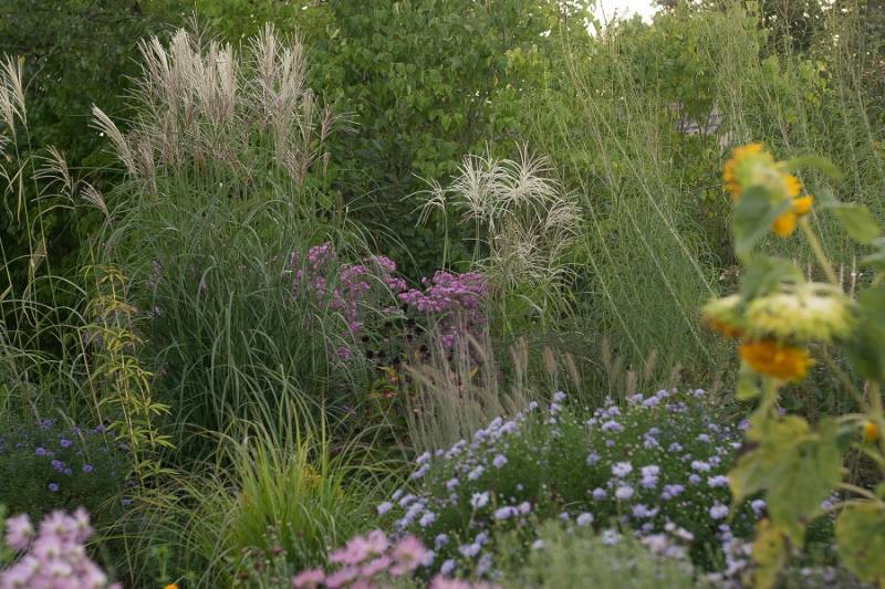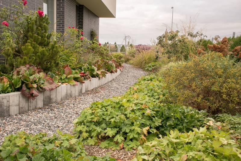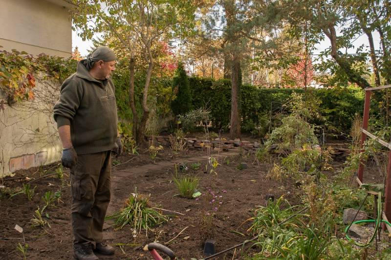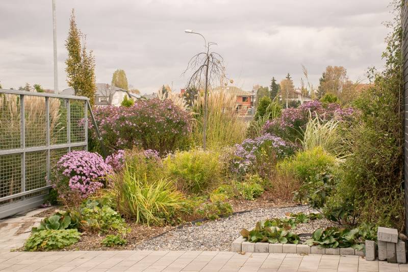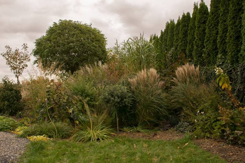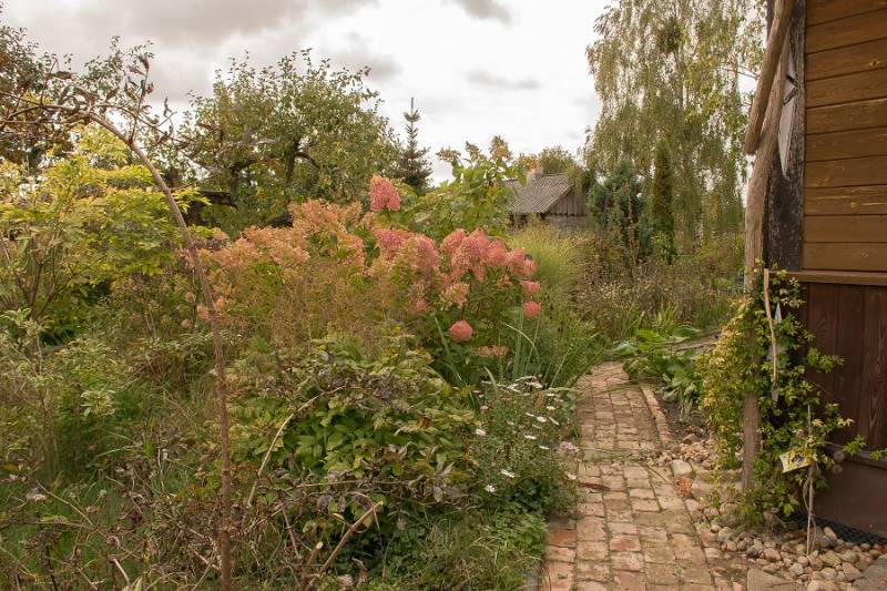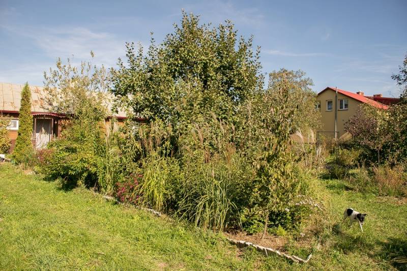 Wokół sosny powstała lekko podwyższona półcienista rabata. Tu parzydło paprocie, rodgersje, saruma, epimedium. Może odżyje rodek smirnovi, który jeszcze nigdy nie kwitł.
