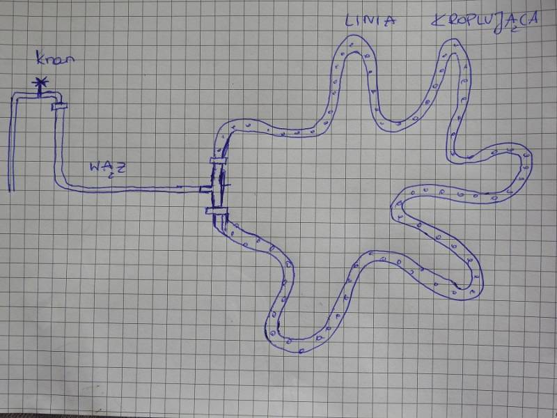 Żeby nie stać z wężem po kilka godzin, jeśli ma ktoś ujecie wody wodociągowej to może zmajstrować system nawadniania kropelkowego według schematu