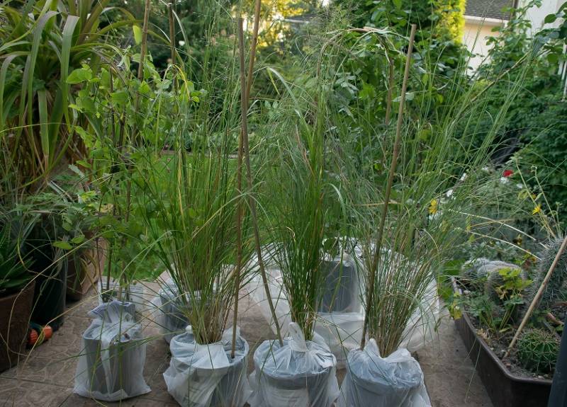 Od Ewy Jarmulak trawy(Sporobolus różnołuskowy i Przyostnia razy dwa), powojnik Purpura Plena Elegans i róża Venusta Pendula