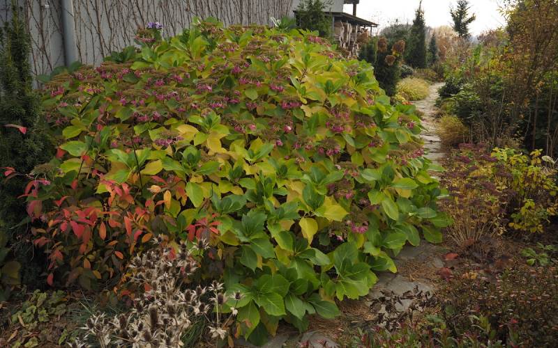 Przebarwiła się ślicznie i długo trzyma te kolorowe liście. Do tego bardzo późno kwitnie więc efekt jesienny jest oszołamiający. Z roku na rok jest większa więc robi coraz lepsze wrażenie.