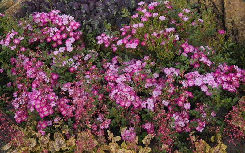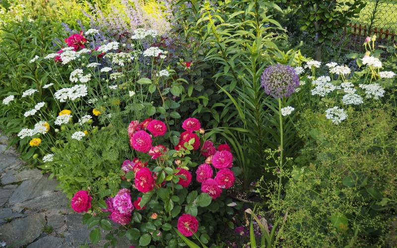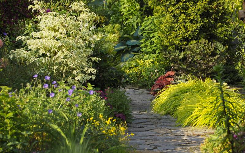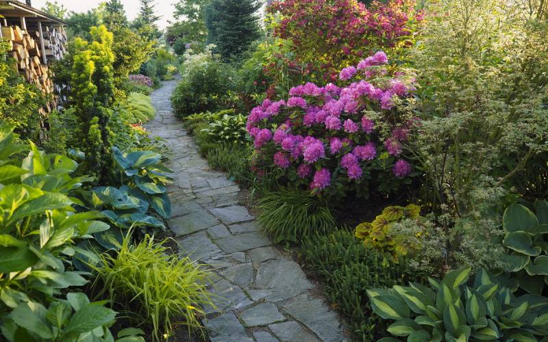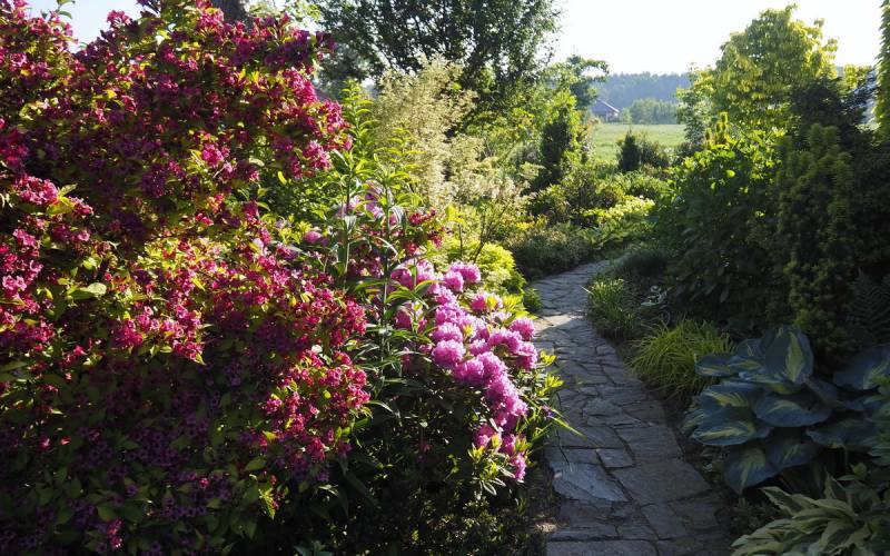 Zakątki ogrodowe cudne... Zdjęcie 12 z różowym RH zdziwko ścieżka jak w zaczarowanym ogrodzie... A przed tym RH co rośnie? to klonik jakiś think: - na zdjęciu po prawej stronie nad hostami.