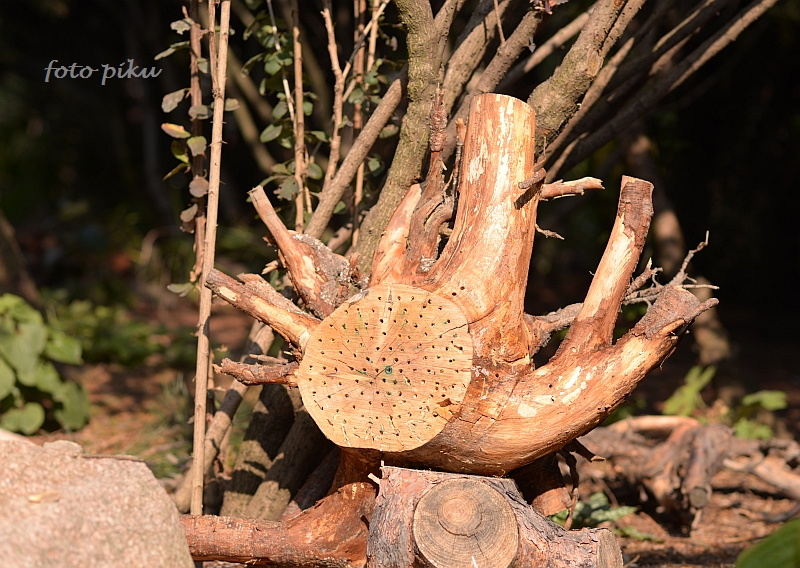chrząszczy. Kanaliki o głębokości 6–12 cm i średnicy 2–7 mm powinny biec pod różnym kątem. W jednym pniaczku może być wiele otworów, ale należy pamiętać o tym, że im grubsze kawałki i większy dystans otworów od krawędzi (kory), tym lepsza izolacja domku przed mrozem.