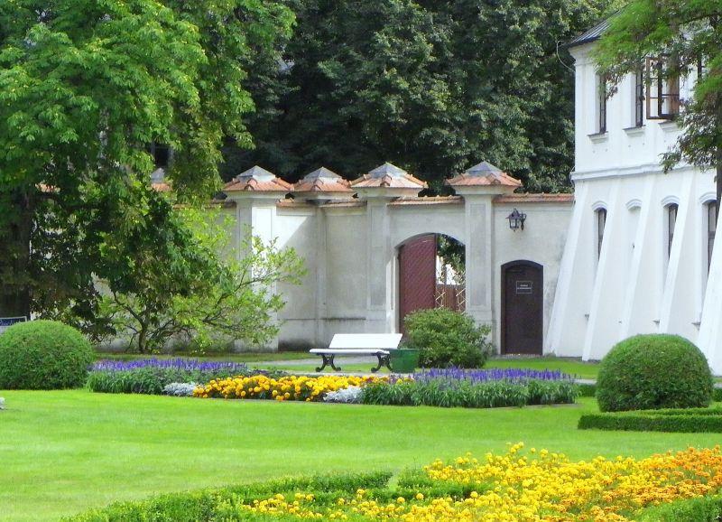 Cały teren, wraz z barokowym założeniem parkowo-ogrodowym , z rosarium i przyległymi budynkami , jest zadbany i z pietyzmem pomyślano o najdrobniejszych elementach , które mogłyby oddać klimat minionych czasów; w wolierach parkowych, w bażanciarni, możemy podziwiać jaskrawo kolorowe bażanty, zaś po olbrzymim dziedzińcu przechadza się dumie paw , pokrzykując swoim zachrypniętym , donośnym głosem, na turystów zakłócających mu spokój swoją obecnością. Bramę wjazdową zdobi herb Zamoyskich - Jelita - ze słowami , które podobno wypowiedział do , Władysława Łokietka po bitwie pod Płowcami , protoplasta herbowy Florian Szaryusz ( Szary) "To mniey boli.." .