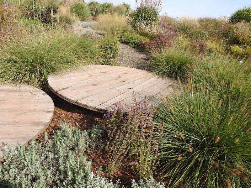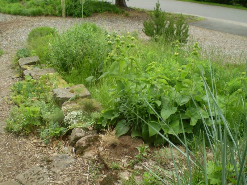 Tymczasem, znaleźliśmy się w pokoju preriowym...Na lewo od ściezki podniesiono nieco skarpę tworząc prostokątny placyk, wokół którego zbudowany jest kilkuwarstwowy murek z prostokątnych kamieni. To właśnie miejsce skupia wiele gatunków i odmian roślin, które kojarza się nam z typową prerią. Własciciele podkreslili ten charakter ściółkując glebę nieregularnym żwirem
