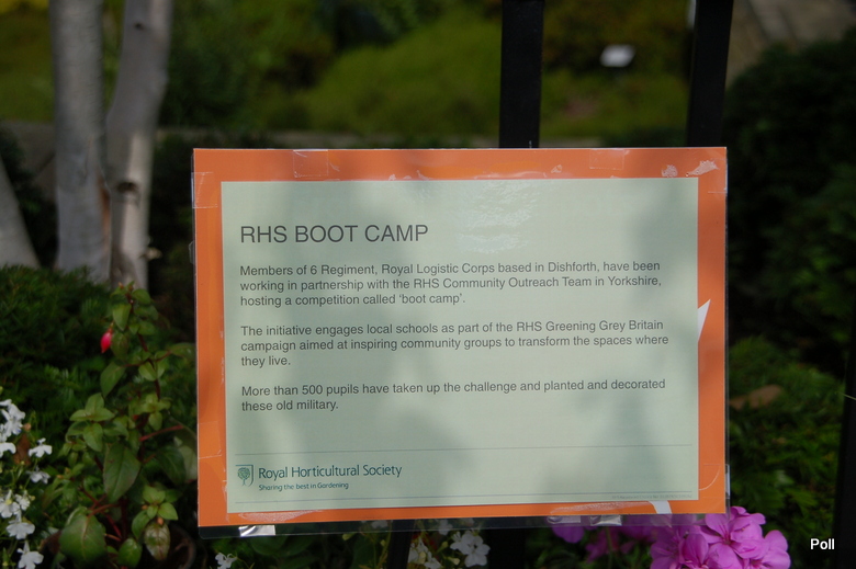 Ten problem jest coraz częściej podnoszony w prasie, czy telewizji. Bije się na alarm, ze Anglia staje się szarym, wybetonowanym krajem. Stąd sporo inicjatyw, m.in. RHS (Królewskie Towarzystwo Ogrodnicze), które mają ponownie obudzić ogrodniczego ducha w narodzie angielskim. Podczas mojej ostatniej wizyty w ogrodzie Harlow Carr ( zapewne i Olusi też ) , trwała akcja RHS pod tytułem 'Zazieleńmy szarą Brytanię'. Prowadzono pogadanki, wydano ulotki i plakaty, ale nie tylko... By zwrócić uwagę na problem w jakiś nietuzinkowy sposób, z pomocą 6 Regimentu Królewskiego Korpusu Logistycznego , który współpracuje z RHS CO w Yorkshire, zorganizowano dla uczniów tutejszych szkół 'Boot camp'.