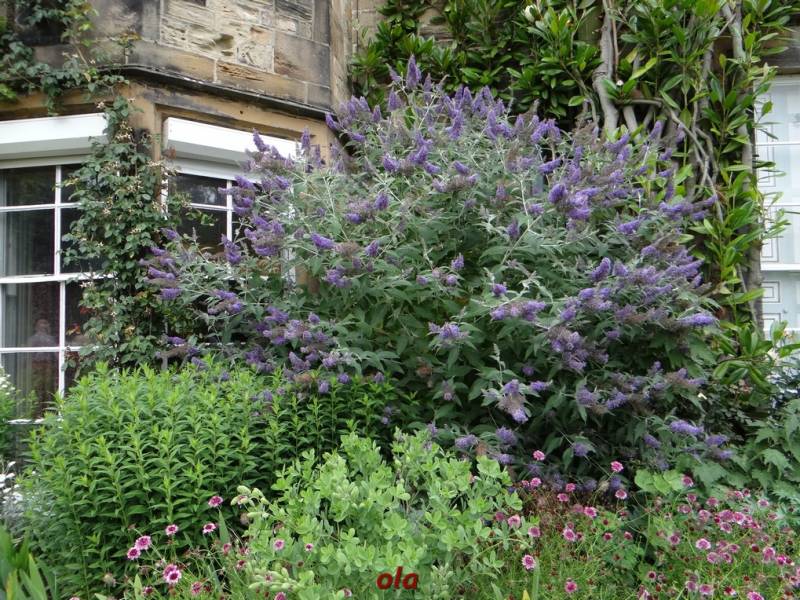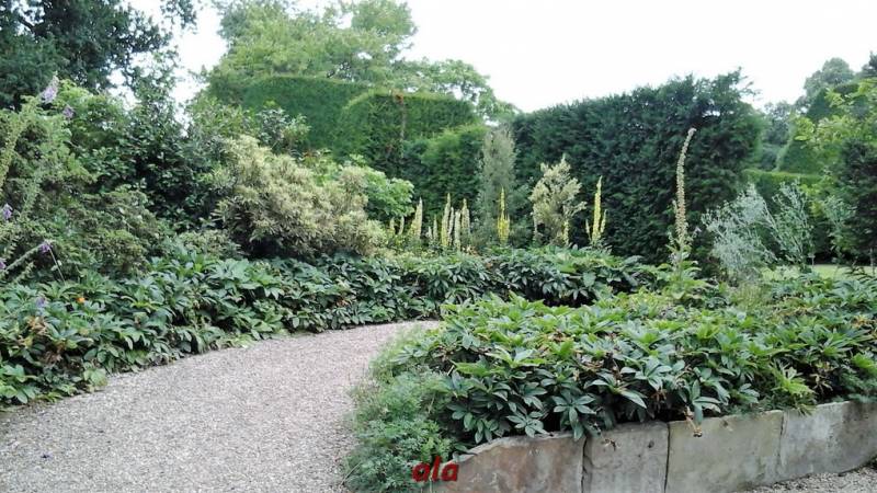 Na tle żywopłotowej zieleni mamy naturalistyczne nasadzenia dużych bylin ( ostróżki , naparstnice ....) i krzewinek i krzewów ( róże , jaśminowce ).