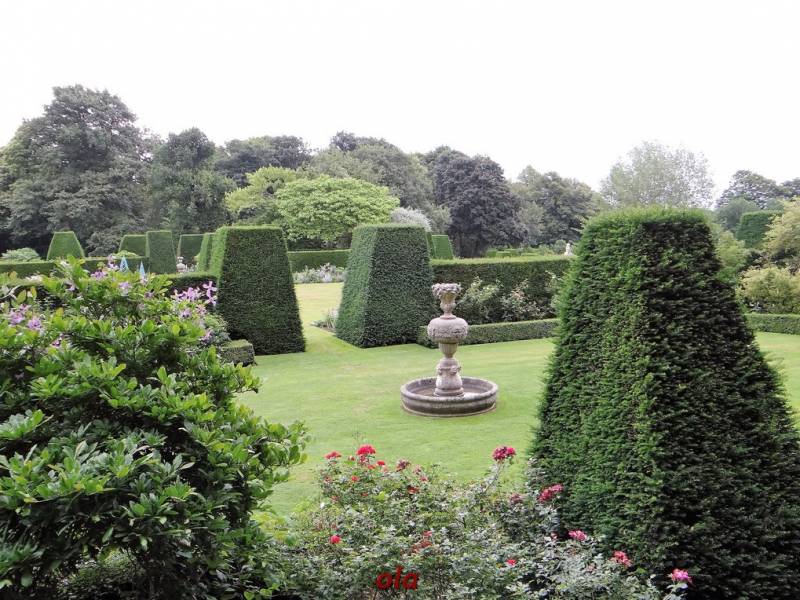 Ogród ma geometryczny układ . Wysokie ściany formowanych cisów tworzą ogrodowe pokoje .