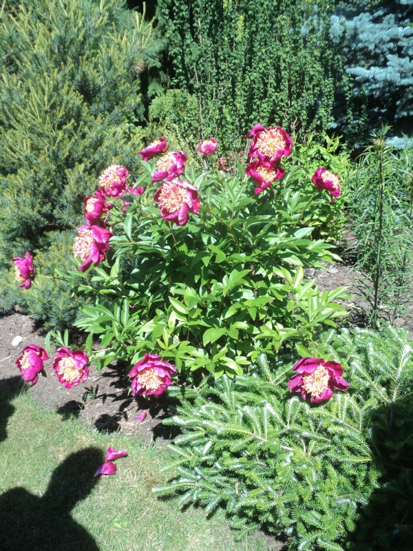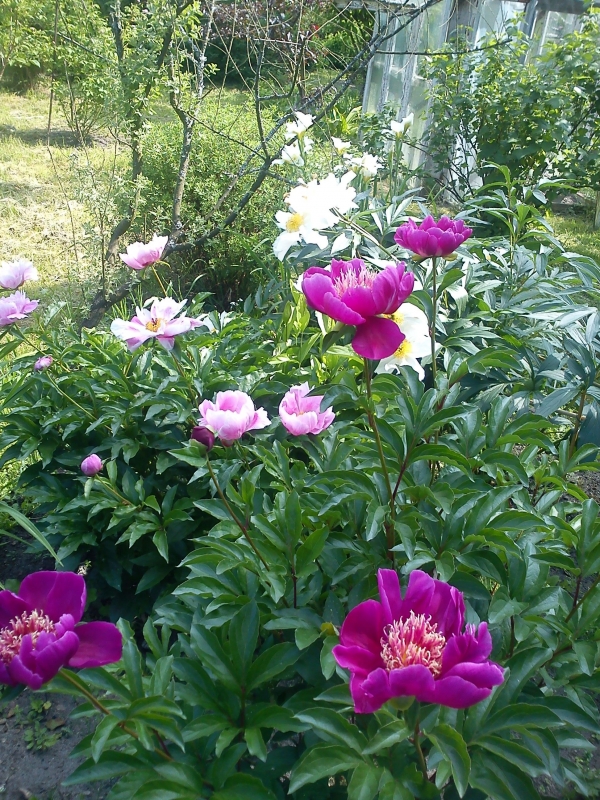 Jednak ogólnie jestem zadowolona, bo peonie są różne (widać po liściach) i jeszcze dobrałam 3 od sąsiadów. (Jedna pudrowy róż, druga powinna być Festiva Maxima i trzecia to późna różowa - kwiat wielkości talerzyka hu_rra - oczywiście do zabawy w rozpoznawanie za rok).