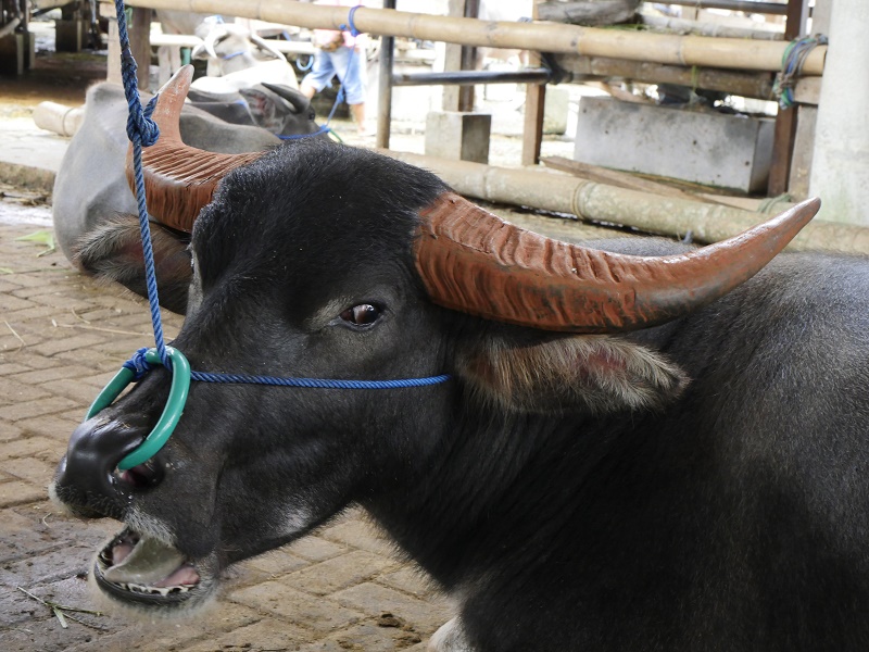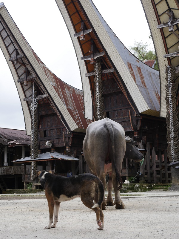 Bawoły to najwazniejsze, święte zwierze w tym regionie. To on przewozi chorego z ziemi do raju- podczas ceremoni bawoły są rytualnie zabijane, mięso zjadane, a rogi wieszane prze domami na specjalnych postumentach , a ich ilość świadczy o statusie mieszkańców domu. Jeżeli podczas ceremoni pogrzebowej, poświęconych zostanie co najmniej 15 bawołów, przed grobem zmarłego można postawić jego drewnianą podobiznę naturalnej wielkości, zwaną TAU-TAU. Byliśmy w przcowni rześbiarza który takie podobizny rzeźbi.