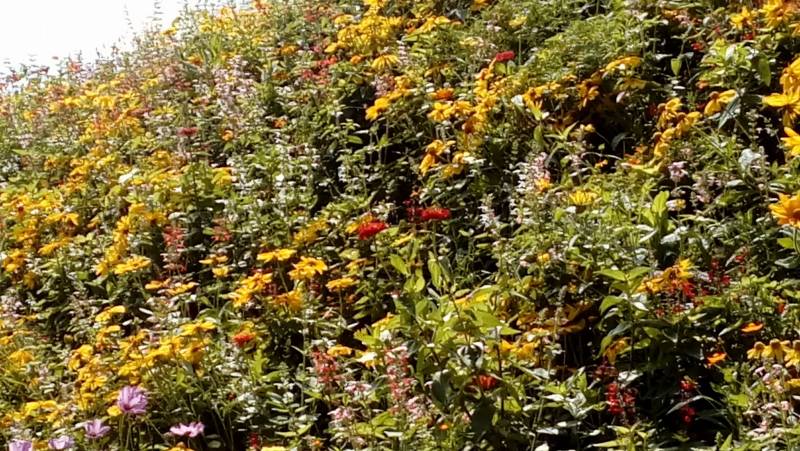 Górna częśc mniejsza chociaż bogatsza w rośliny.Jest tam klomb z różami.Wzdłuz muru rosna piwonie.Całośc uzupełnia ta piekna hortensja i