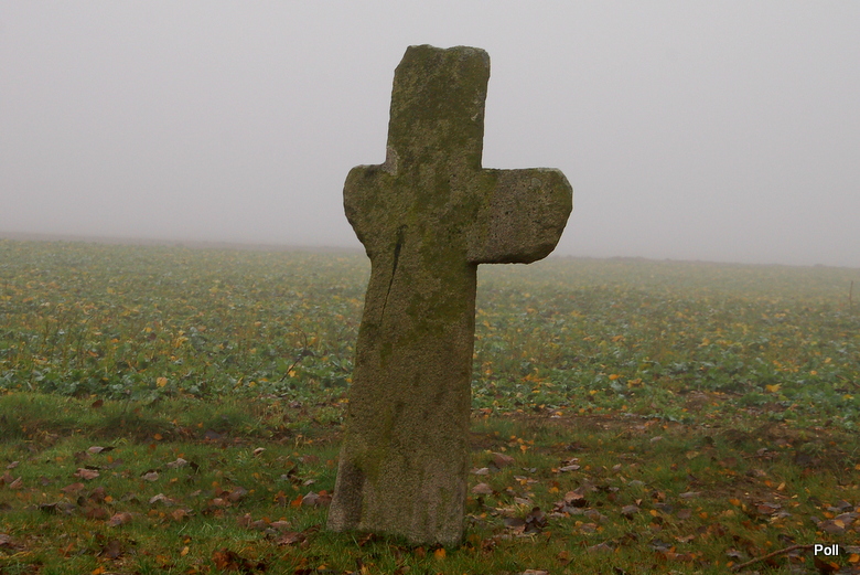 Bardzo wysoki, nieco uszkodzony krzyż pokutny we wsi Tokary. Zdjęcie robiłam w sobotę, ok 8.30. Mgła, ze nożem można było kroić