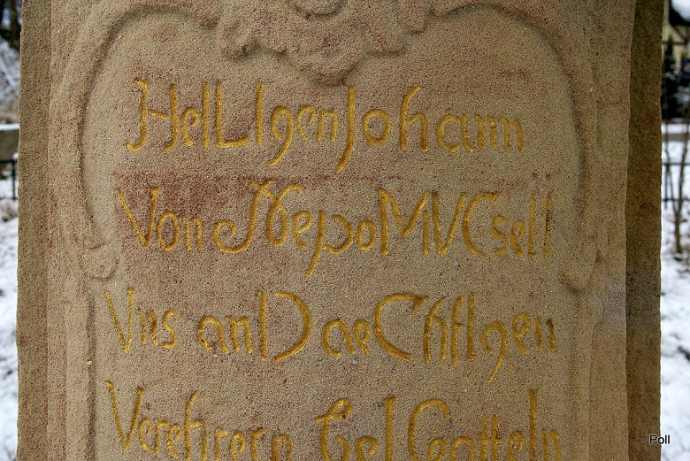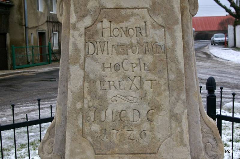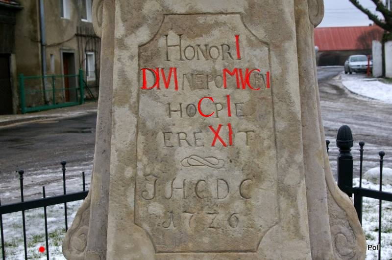 Polu, próbowałam policzyć datę z chronostychu, ale jest obcięty tekst na zdjęciu. Na stronie nepomuki.pl natomiast znalazłam ciekawą informację, że po renowacji policzyć można obecnie dwie wersje daty z napisu (odnawiając przywrócono ponoć pierwotną wersję): 1787 lub 1789, zależnie jak się w jednym z wyrazów policzy "ü".
