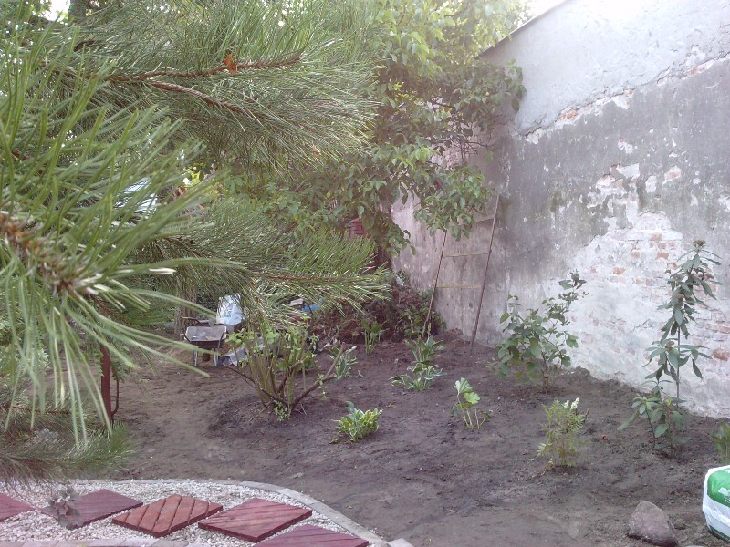 sąsiedztwo wysokiej ściany garażu sąsiadów, która stanowi granicę rabaty i w tym miejscu także granicę ogrodu od strony południowo-wschodniej. Ściana została obsadzona