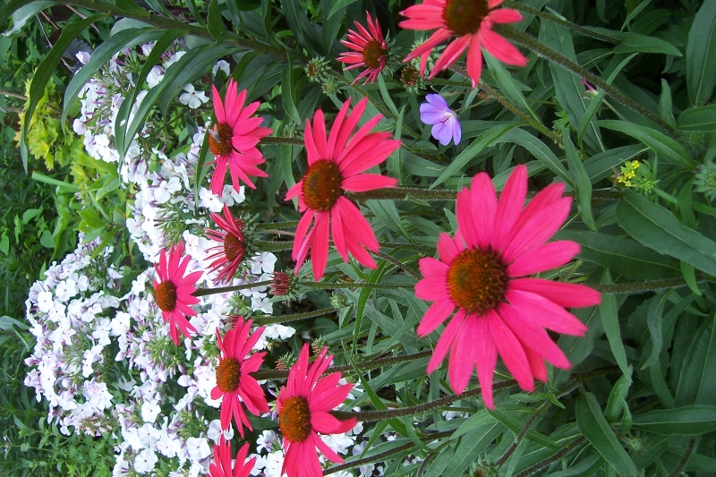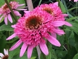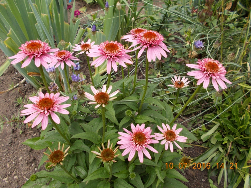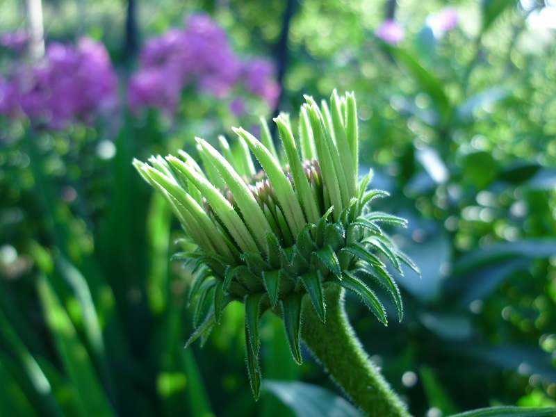 Kwiaty fioletowe lub fioletowo różowe kwiaty języczkowe przytwierdzone do wypukłego osadnika kwiatostanu.