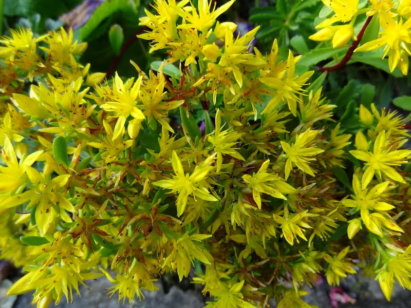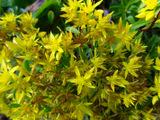 Kwiaty żółte, gwiazdkowate zebrane w nibybaldaszki na pędach kwiatowych dorastających do 30 cm.