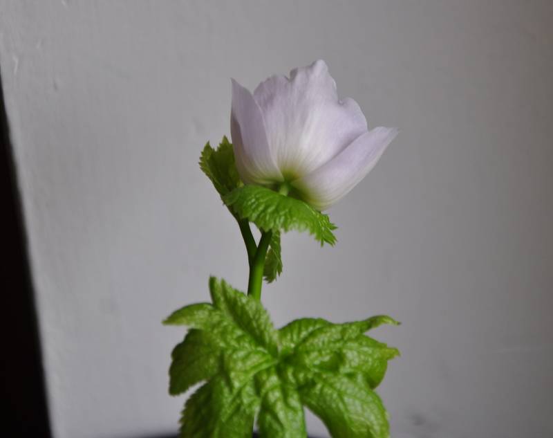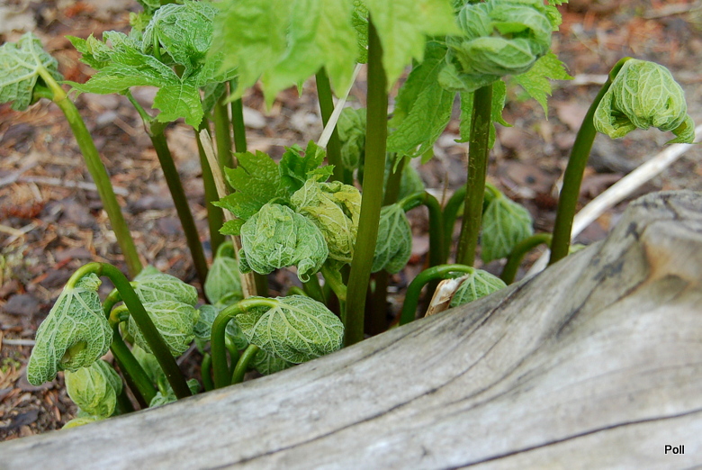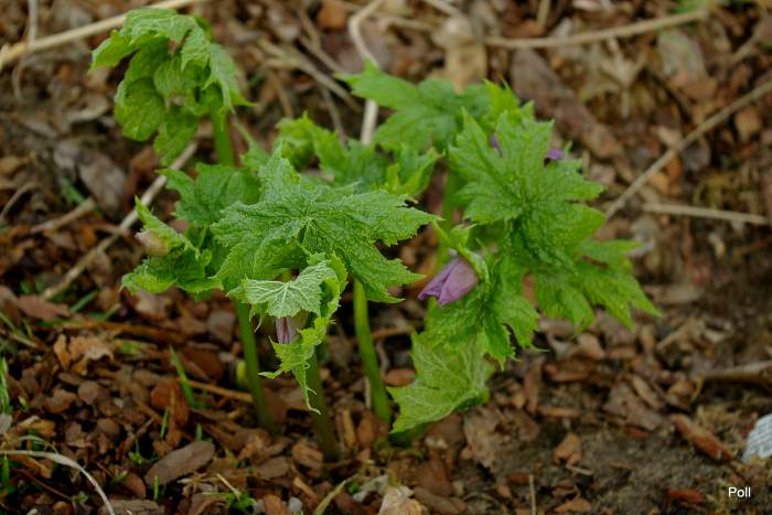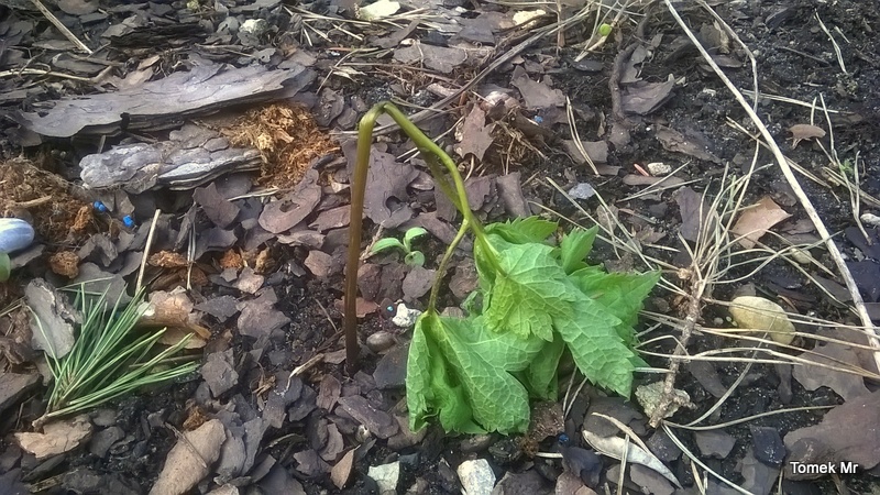 W ubiegłym roku , kiedy opadły na nas pierwsze przymrozki, glaucidium dopiero wychodziło z ziemi i nic złego mu się nie stało.Po zapowiedziach następnej fali zimna, ochroniłam je włókniną podwieszoną na czterech kołkach tak wysoko, by nie dotykało rośliny. Końce włókniny przycisnęłam do ziemi kamieniami i kawałkami drewna. Teraz włókninę zdjęłam, ale kołki zostawiłam...na wszelaki słuczaj.