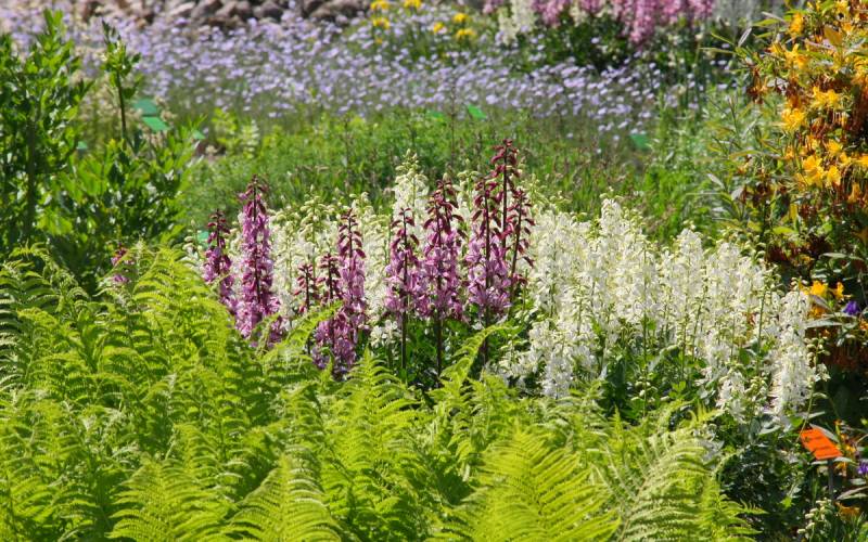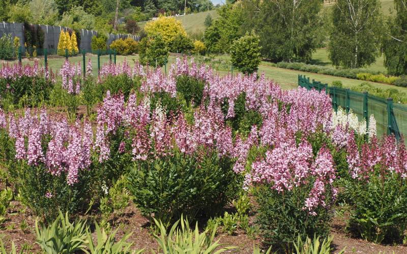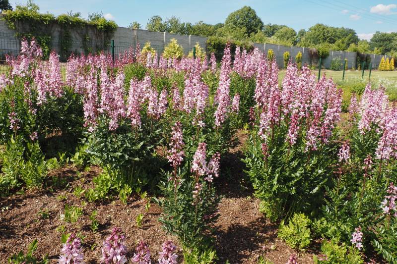 Kwiaty różowe i białe, z ciemniejszymi żyłkami, zebrane w grona na szczytach łodyg.