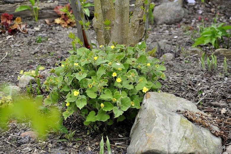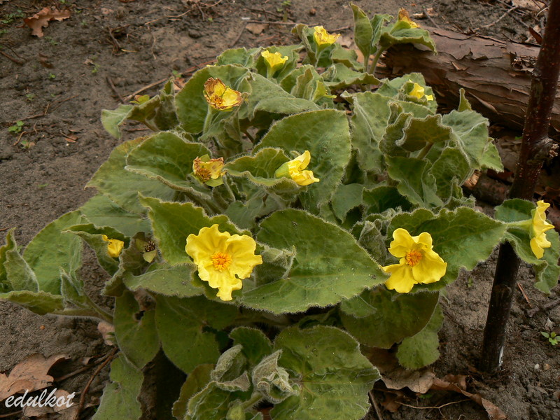 Kwiaty w kolorze żółtym mają po trzy pomięte płatki wokół żółtych pręcików. Wyrastają w kątach liści na średniej długości ogonkach.Kwitnie od kwietnia, powtarzając kwitnienie przez całe lato. Po kwitnieniu wytwarza nasiona.